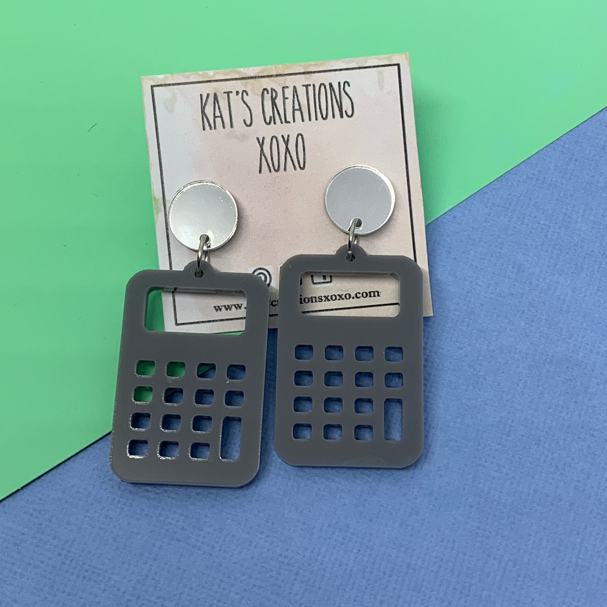Silver mirror earring toppers with grey glossy calculator- best of all design worlds!
