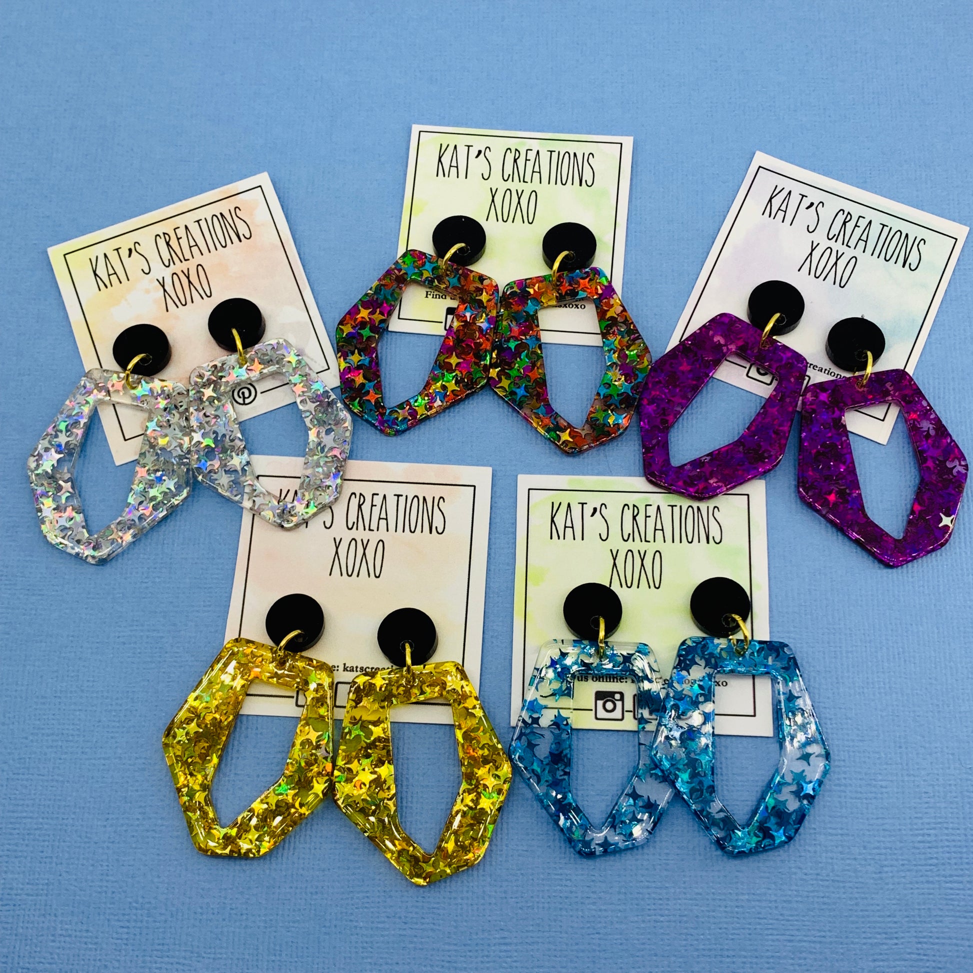 The star burst glitter in these earrings is random, and no two pieces are identical. They are truely unique for you! These beauties shine awesomely when they sun catches on them.