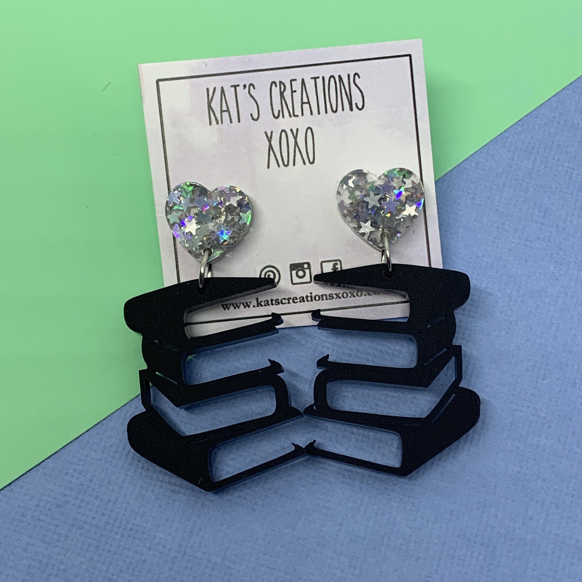 A tower of matte black silhouette books dangle from a holographic silver glitter heart. Super cute dangles that are light in weight, heavy on impact!
