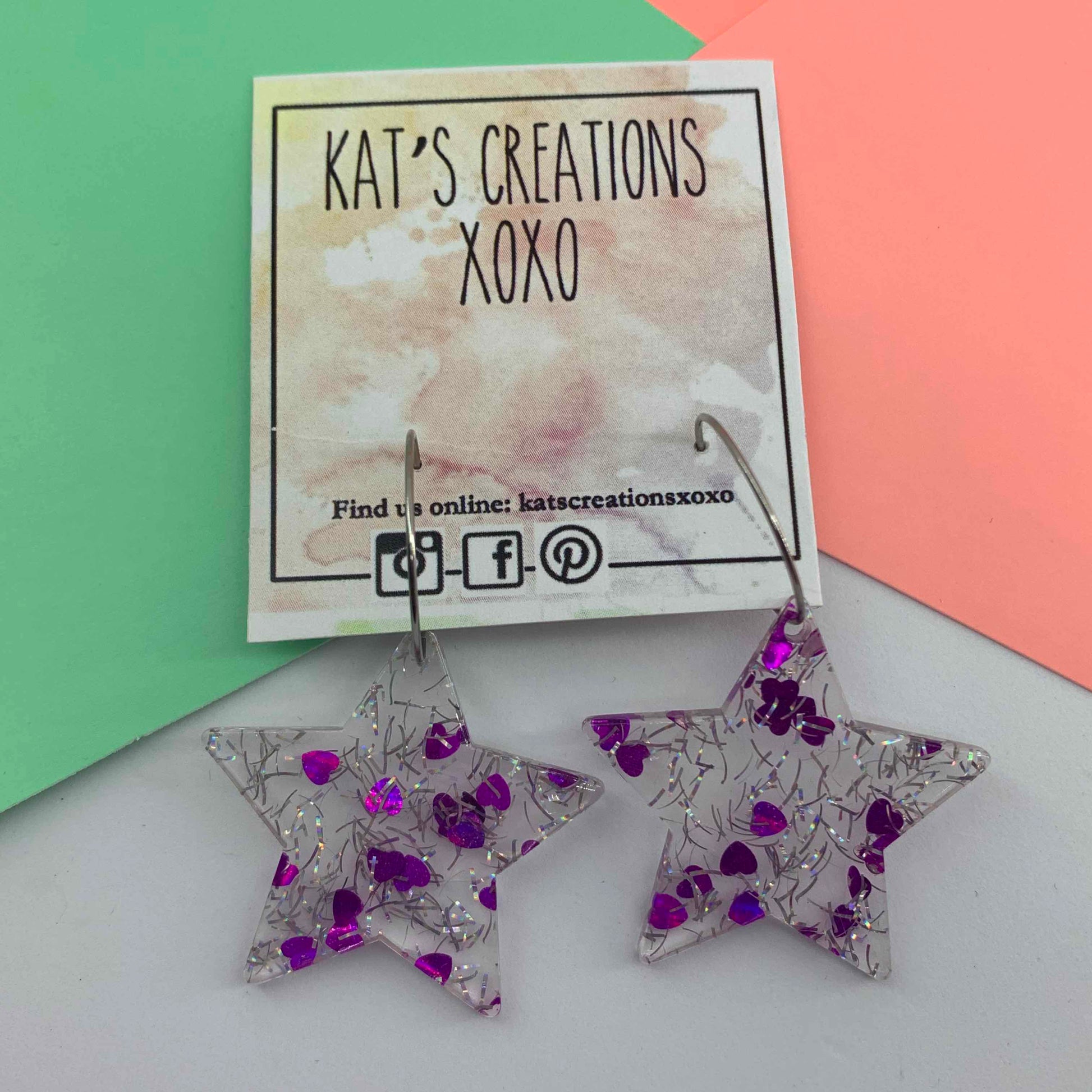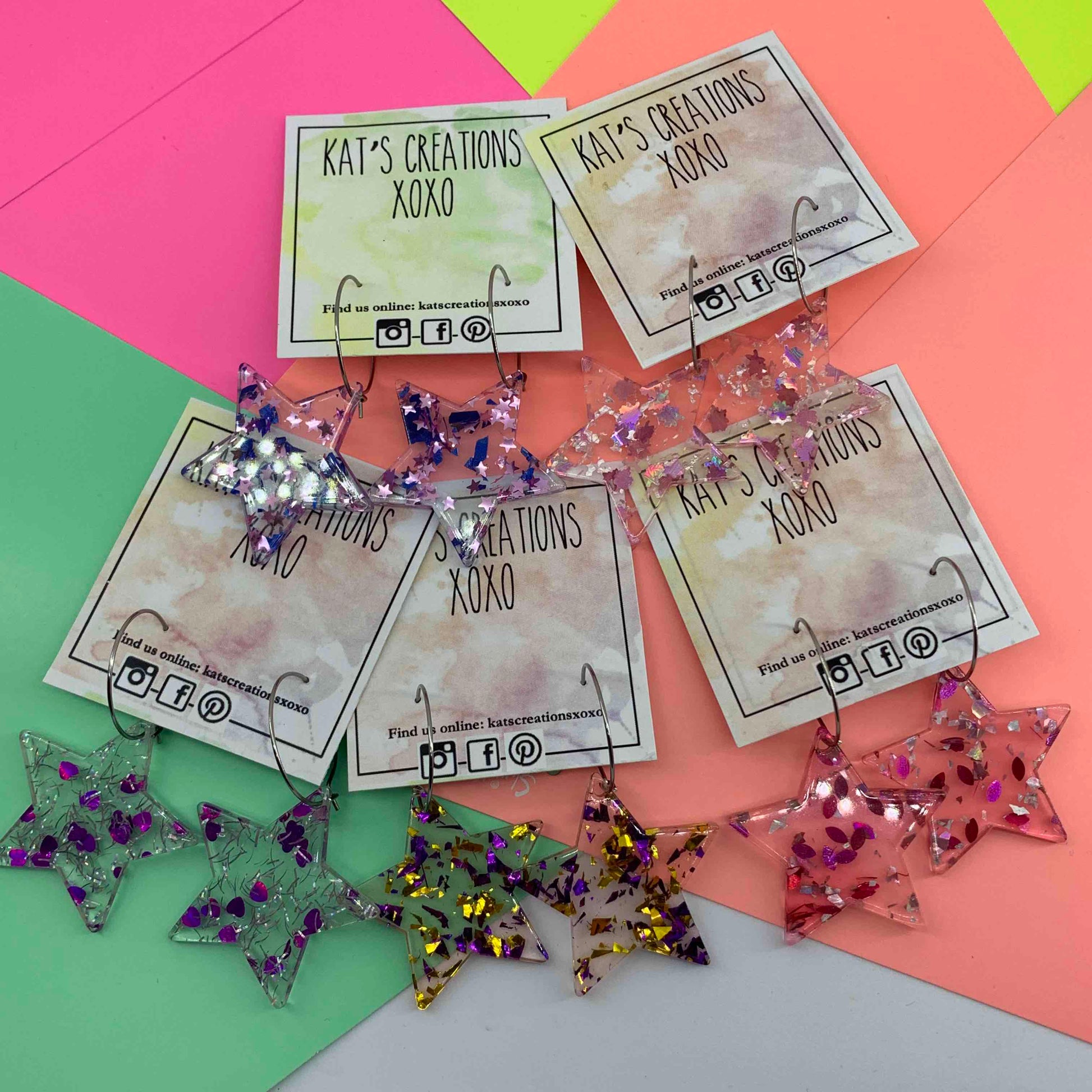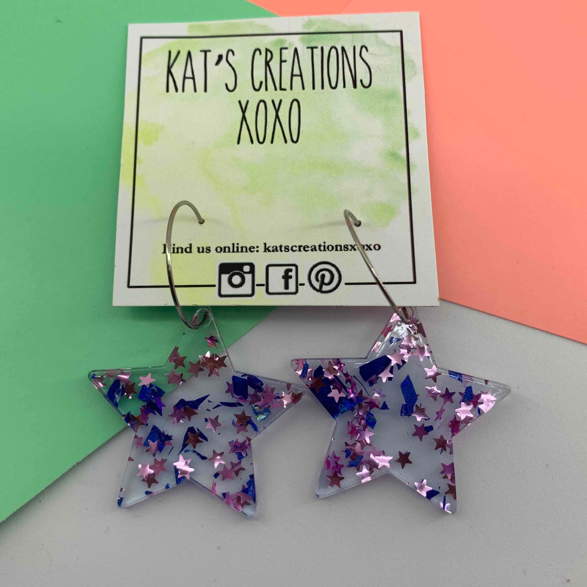 The acrylic star (35mm) dangles off a 23mm stainless steel hoop for a total drop of 58mm. Lots of movement and fun! Make sure you select a colour out of the 5 different options.