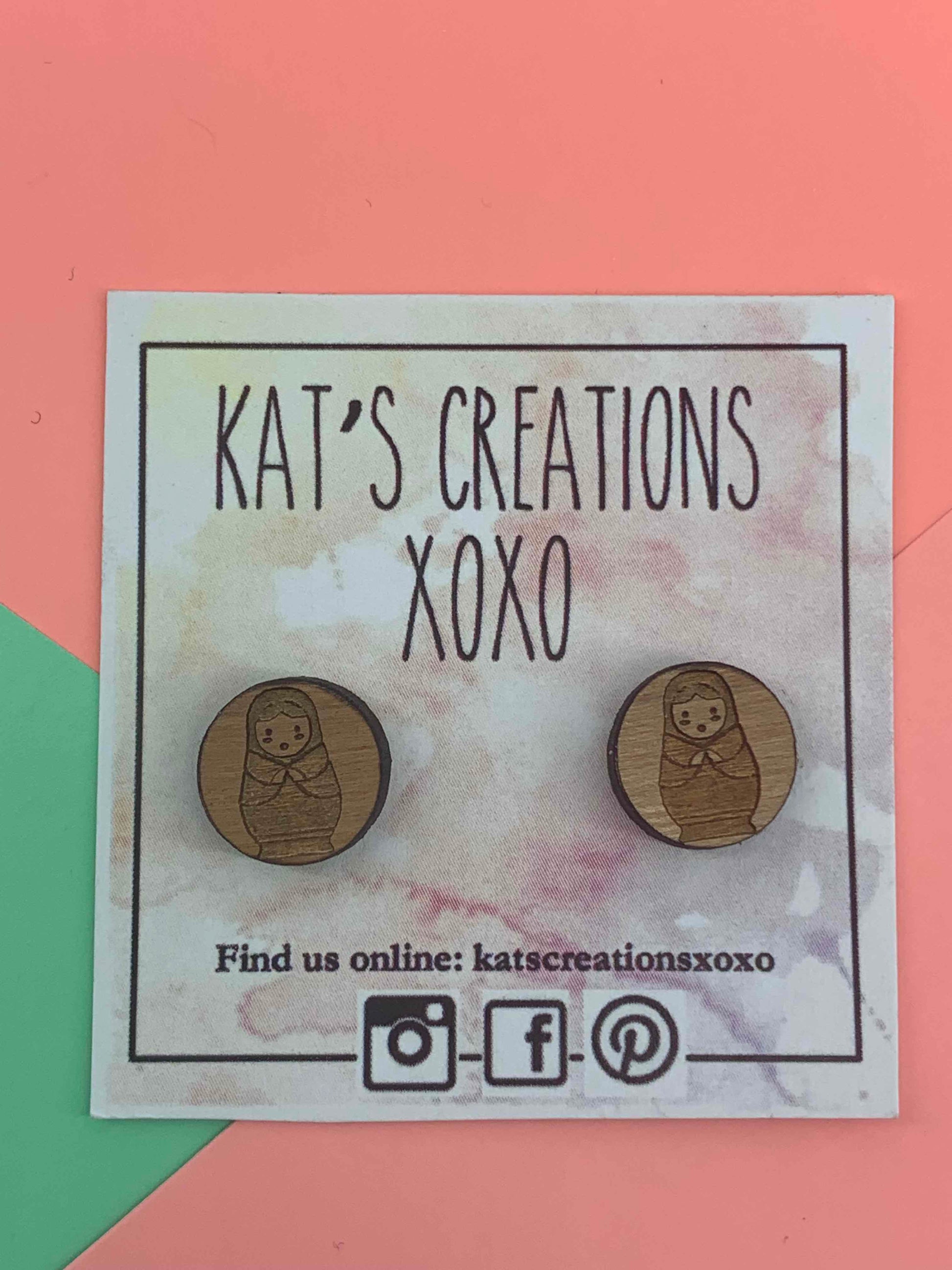 Small wooden studs with laser etched image of a babushka doll. These studs are perfect for a minimal look, but definitely eye catching and unique.