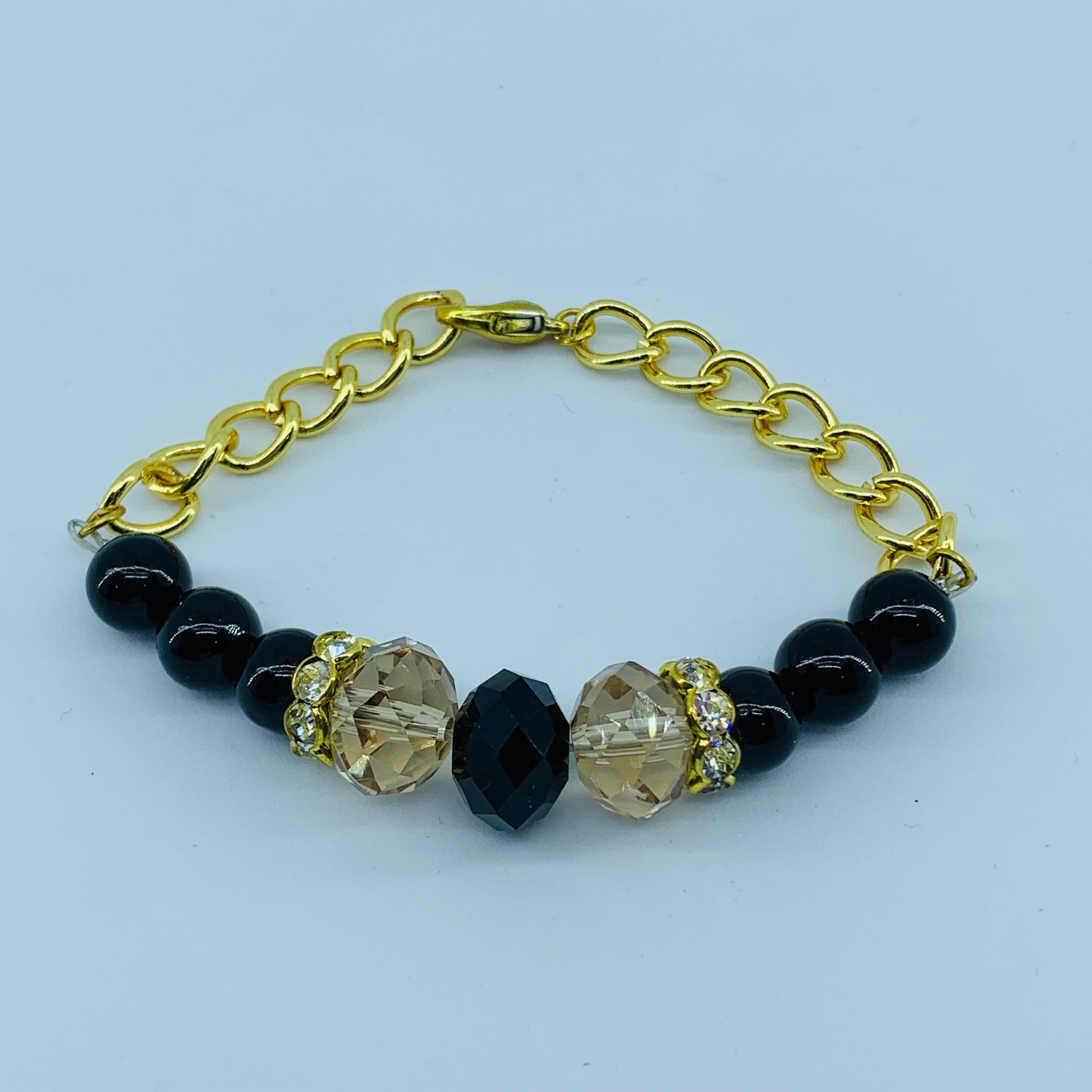 Made of glass black & champagne coloured beads and diamond look rondelles, this bracelet can easily see you from day to night. Simple and elegant yet eye catching and bold! The sparkle on this is fabulous. The photo doesn't do it justice at all.